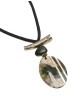 Collar largo ajustable con colgante ovalado en madera y resina verde con chips dorados y detalle metálico grabado.