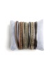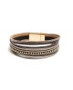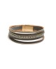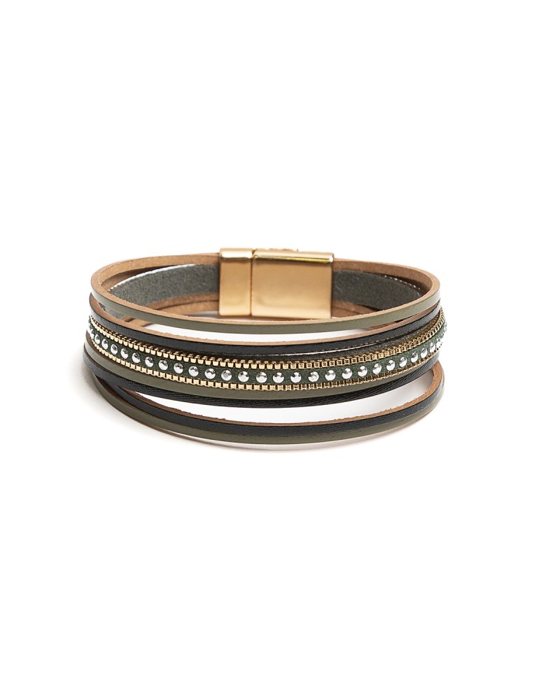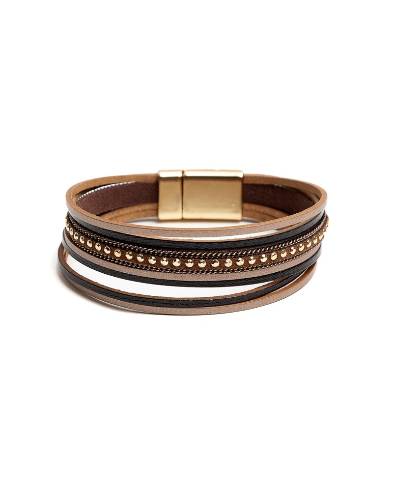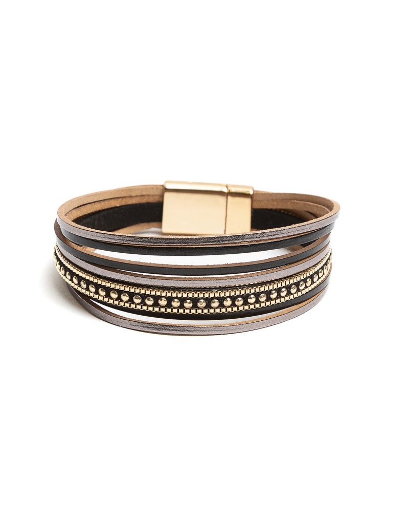 Pulsera de multilíneas con tiras en distintos tonos, mini tachuelas y cadenilla decorativa. Cierre magnético.