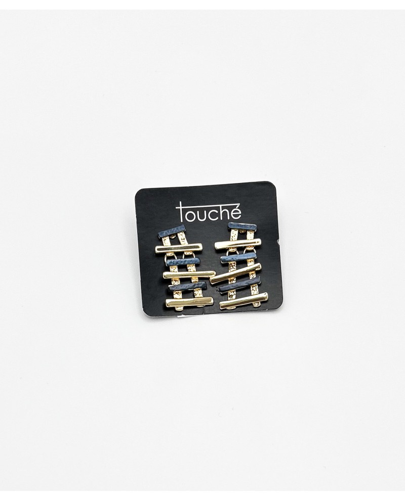 Los pendientes azules de Touche destacan por su estilo contemporáneo y su combinación perfecta de color y brillo. Con pequeñas barras metálicas en tonos dorado y azul, aportan un toque sofisticado y luminoso a cualquier look.