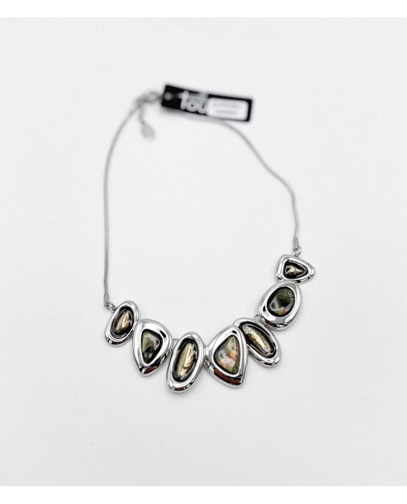 La gargantilla plateada de Touche combina elegancia y diseño en una pieza llena de personalidad. Está compuesta por formas irregulares con acabados nacarados en tonos verdes, dorados y marrones suaves, enmarcadas por un contorno metálico plateado que aporta brillo y sofisticación.
