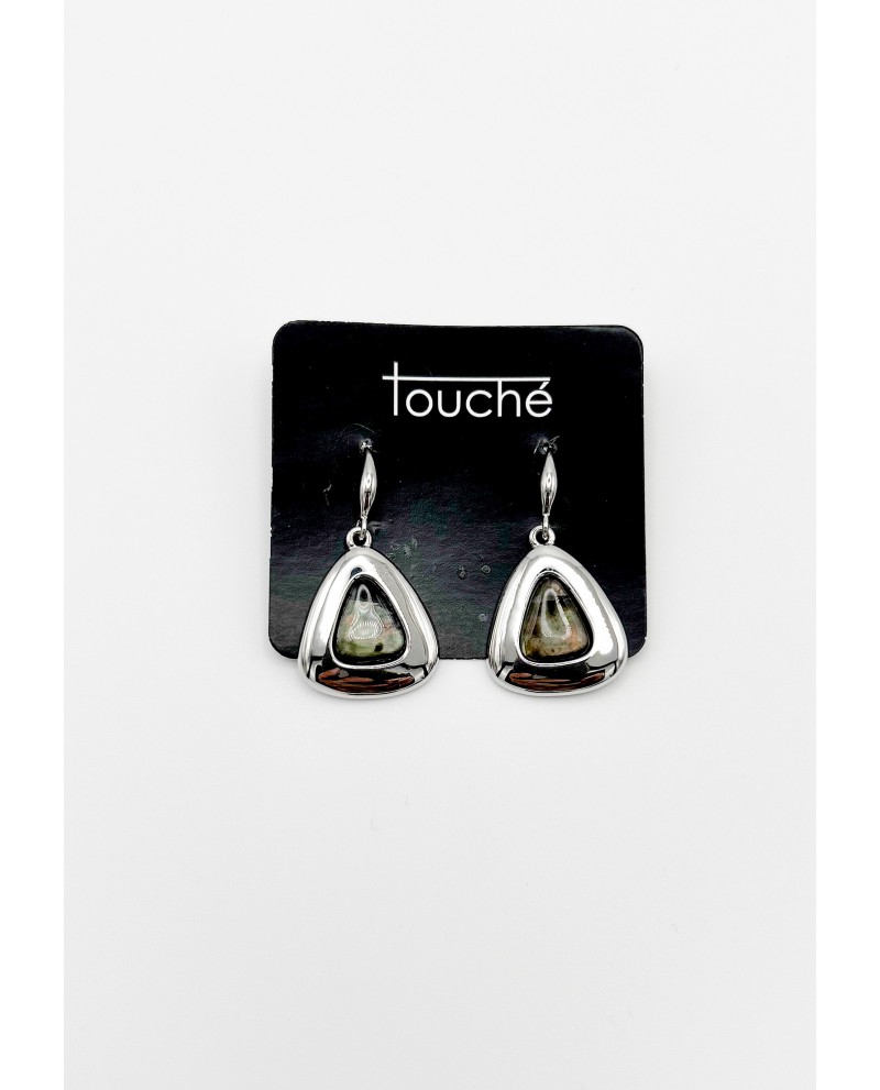 Los pendientes plateados de Touche destacan por su estilo elegante y atemporal. Su forma triangular irregular y el acabado nacarado en tonos verdes, dorados y marrones suaves crean un efecto luminoso y natural, ideal para realzar cualquier look.