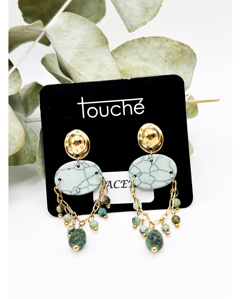 Pendientes originales y llenos de personalidad de Touché con combinación de pieza dorada, efecto piedra turquesa y delicadas cadenas con cuentas colgantes. Un diseño elegante que realza cualquier look.