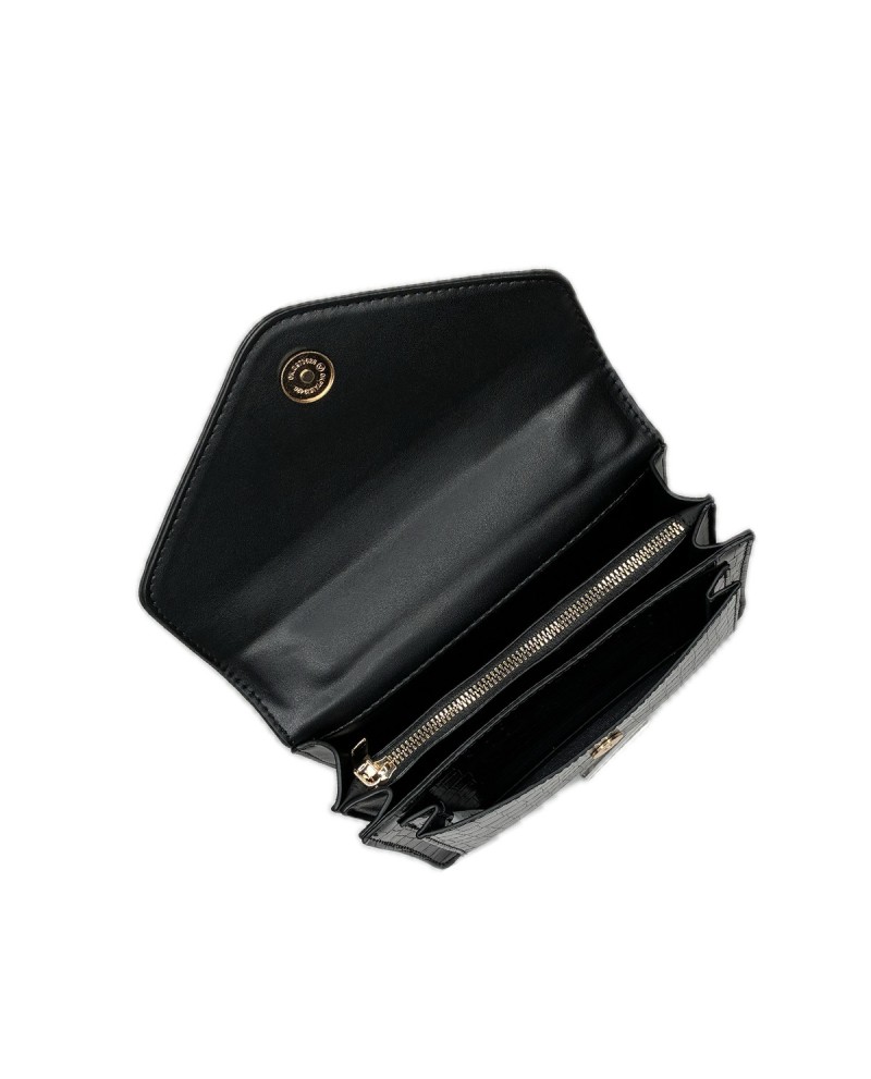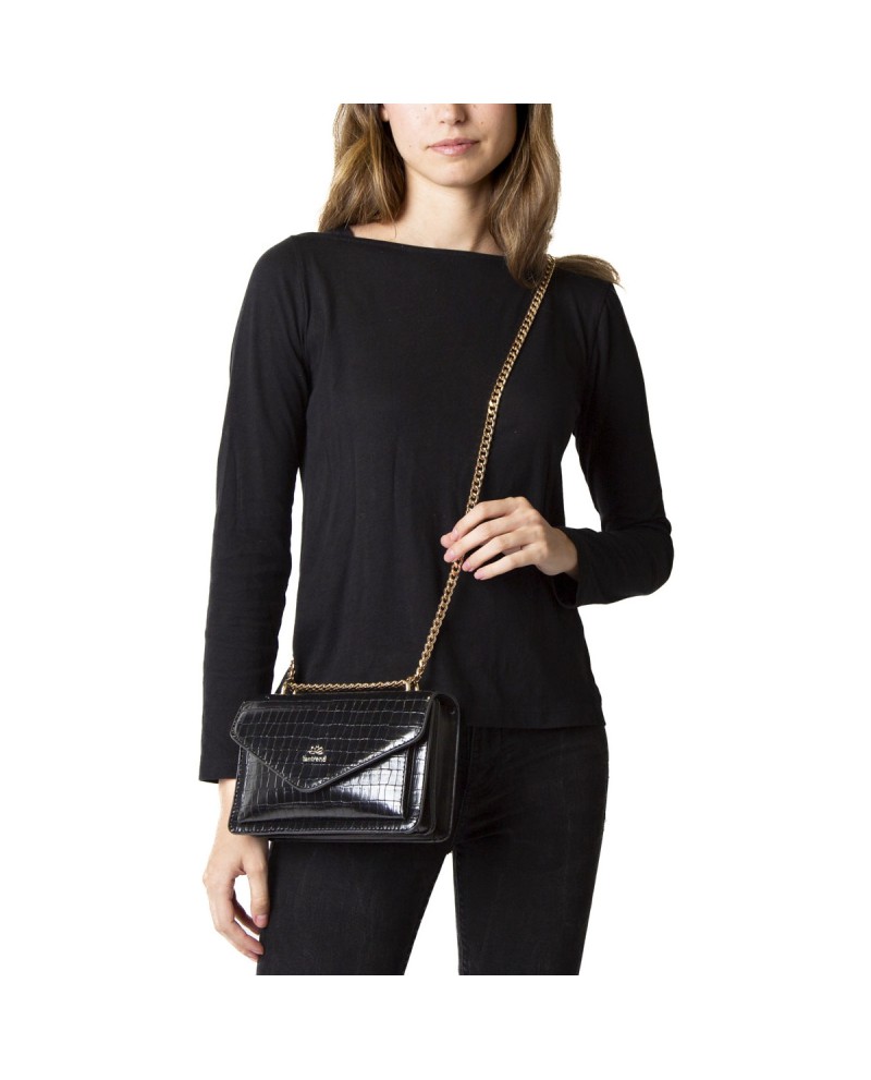 Bolsito efecto cocodrilo en color negro con asa de cadena dorada, doble compartimento y bolsillos interiores y frontales.