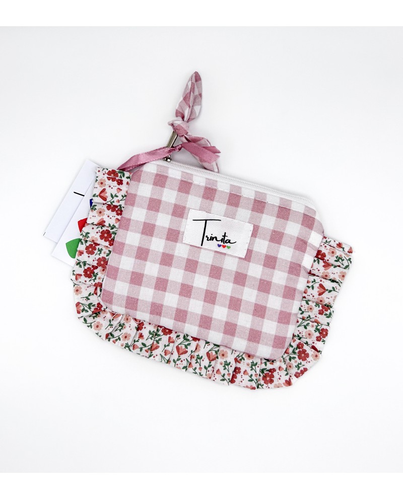 Monedero artesanal de Trinita en color rosa, confeccionado a mano con tejido de cuadros y volante floral. Disponible en más colores.