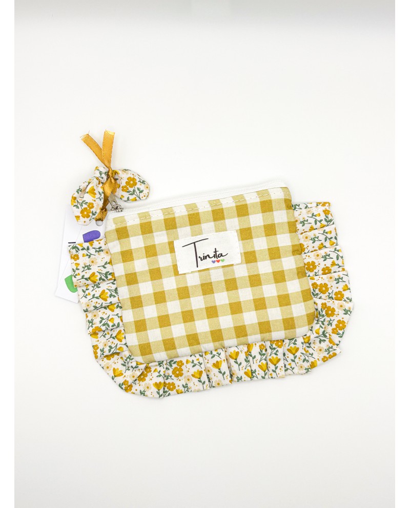 Monedero artesanal de Trinita en color mostaza, con tejido de cuadros vichy y volante floral. Un complemento práctico y original.