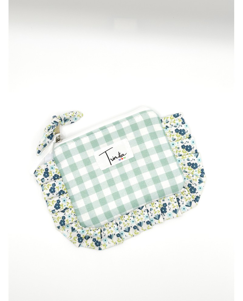 Monedero artesanal de Trinita en color verde, con diseño de cuadros vichy y volante floral. Ideal para diario o como detalle especial.