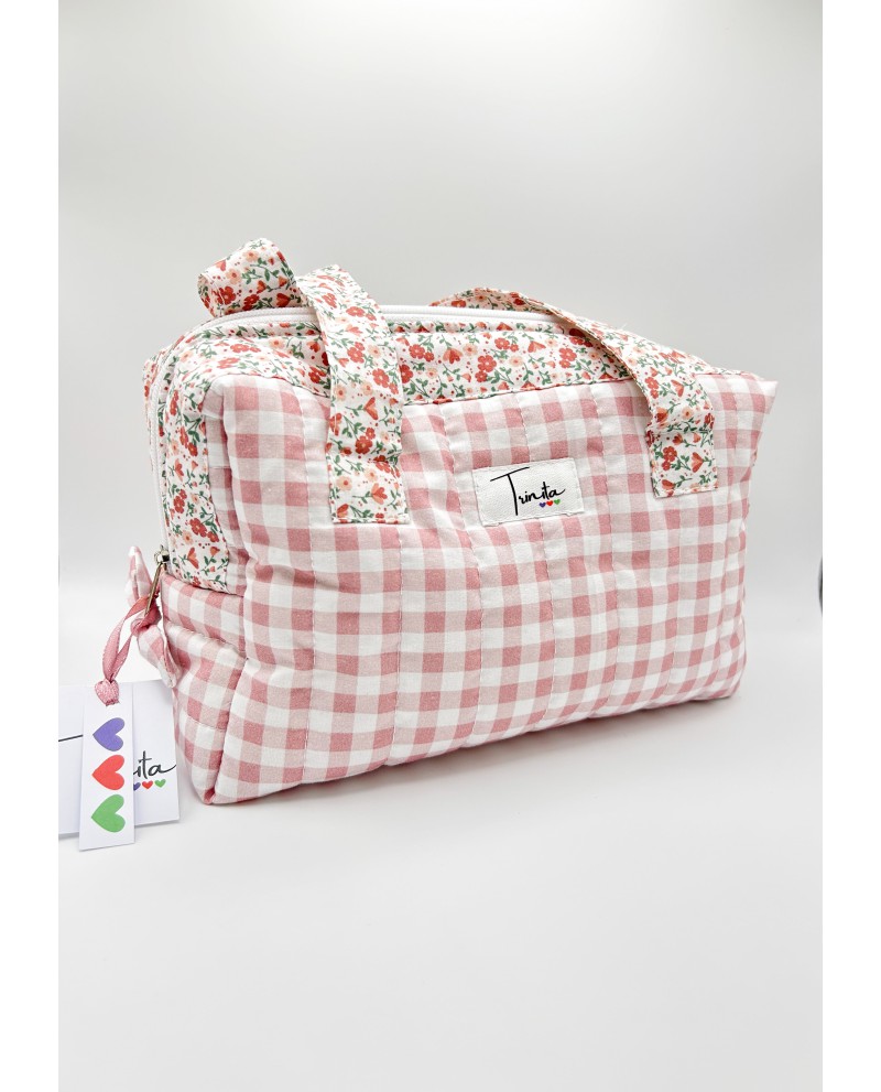 El neceser con asas en color rosa de Trinita es un complemento confeccionado artesanalmente, pensado para acompañarte en tu día a día con estilo y comodidad. Su diseño combina el tejido de cuadros vichy en tonos rosas con detalles florales, creando un acabado alegre y original.