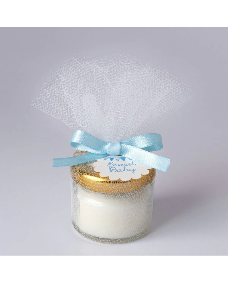 Vela aromática de jazmín en frasco de vidrio con lazo y tarjetita “Sweet Baby”. Ideal como detalle de bautizo. Disponible en rosa y azul.