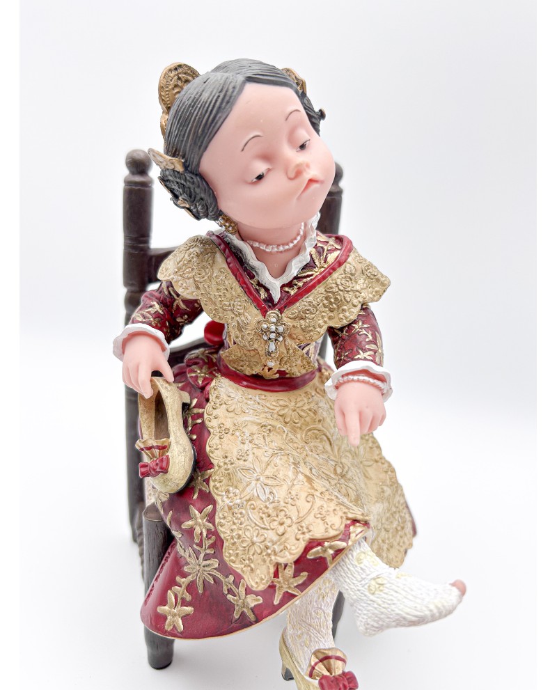 Esta figura fallera de Nadal Creaciones destaca por su delicado modelado, los detalles cuidados del traje tradicional en tonos burdeos y dorados, el aderezo, los moños y la expresión facial tan lograda. Cada elemento transmite la ilusión y el esfuerzo de las más pequeñas durante las Fallas.