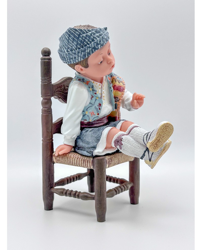 El fallerito aparece sentado en una silla de madera con asiento de mimbre, con la cabeza ligeramente inclinada y el pañuelo anudado, transmitiendo ternura, cansancio y autenticidad. Su indumentaria tradicional está cuidadosamente representada: faja, chaleco, calzón, espardenyes… todo mimado al detalle.