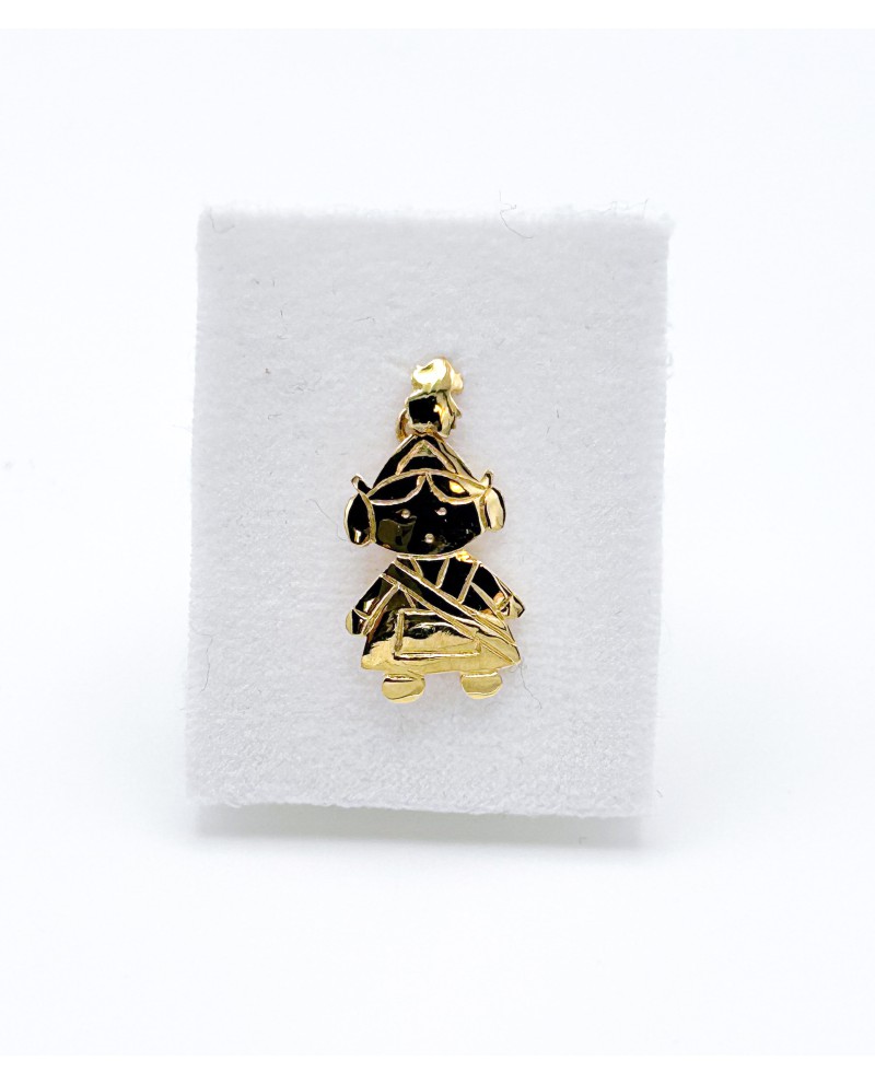 Este colgante de joyería fallera destaca por su delicada figura de fallerita en relieve, bañada en dorado con un acabado brillante y muy cuidado.