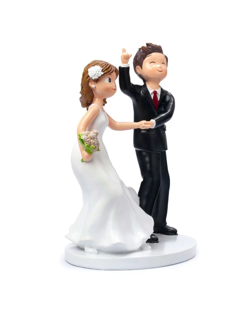 Figura de tarta de boda en resina con novios en actitud divertida, perfecta para dar un toque alegre y original a tu pastel.