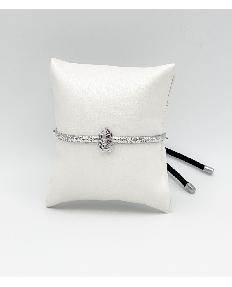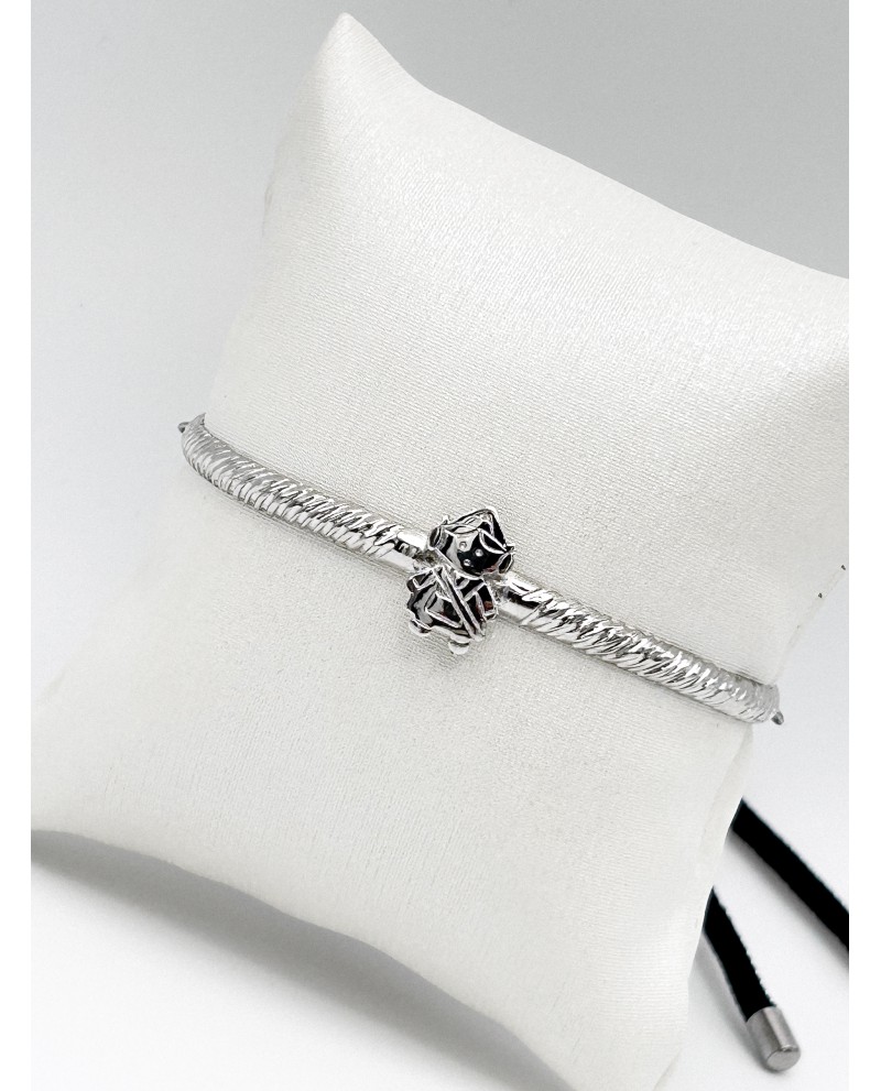 Pulsera con baño de plata y figura de fallerita central. Con cordón negro ajustable, elegante y con toque valenciano.