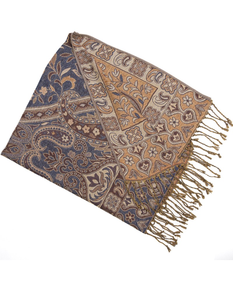 Pashmina de doble faz en tonos azul y beige, con elegantes dibujos búlgaros y acabado en flecos.