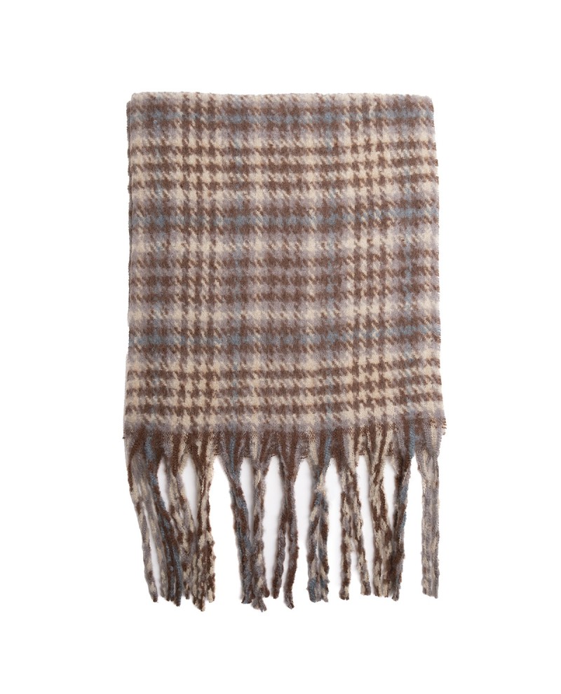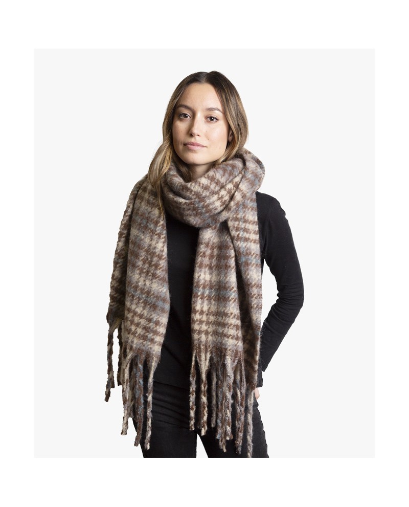 Disfruta del invierno con esta bufanda de cuadros en tonos azul claro y marrón, un clásico renovado que nunca pasa de moda. Su diseño a cuadros aporta un aire atemporal y elegante, perfecto para combinar con looks casuales o más formales.