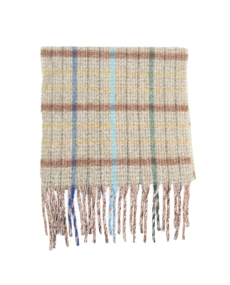 Bufanda extra suave y abrigada en tonos multiazules sobre base beige, con flecos efecto vigoré.