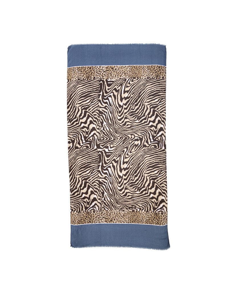 Este foulard multicolor con estampado animal print es el accesorio perfecto para quienes buscan un complemento atrevido y con estilo. Su diseño combina un motivo animal en el centro con extremos en color liso azul, creando un contraste elegante y moderno.