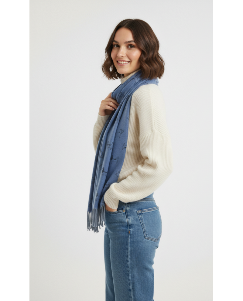 Pashmina de tacto suave con divertido estampado de perritos en tonos azulados. Ideal para dar un toque alegre y cálido a tus looks de invierno.