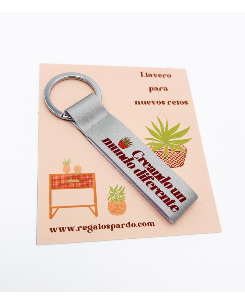 Llavero de tela con la frase “Creando un mundo diferente”, presentado sobre una tarjeta con diseño acogedor. Ideal para regalar a quienes creen en los nuevos comienzos.