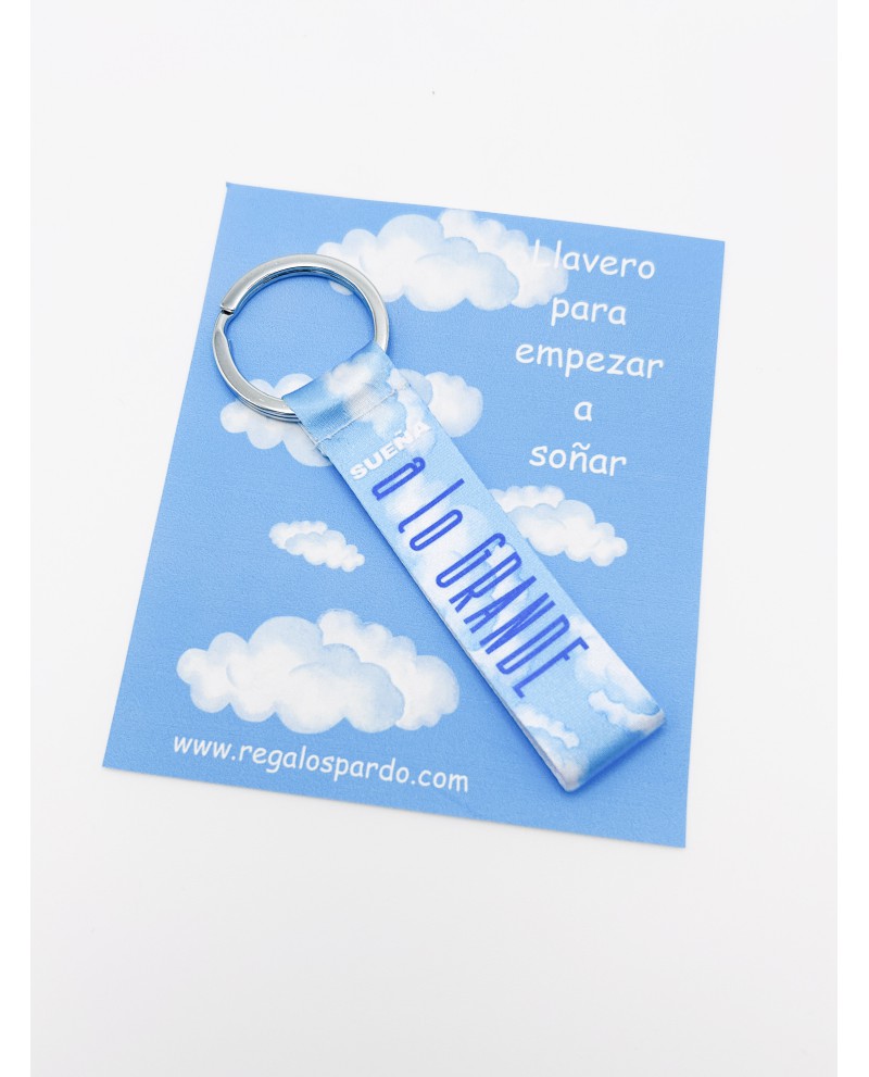 Llavero de tela con la frase “Sueña a lo grande”, decorado con un bonito estampado de nubes. Un detalle inspirador para quienes creen que todo es posible.