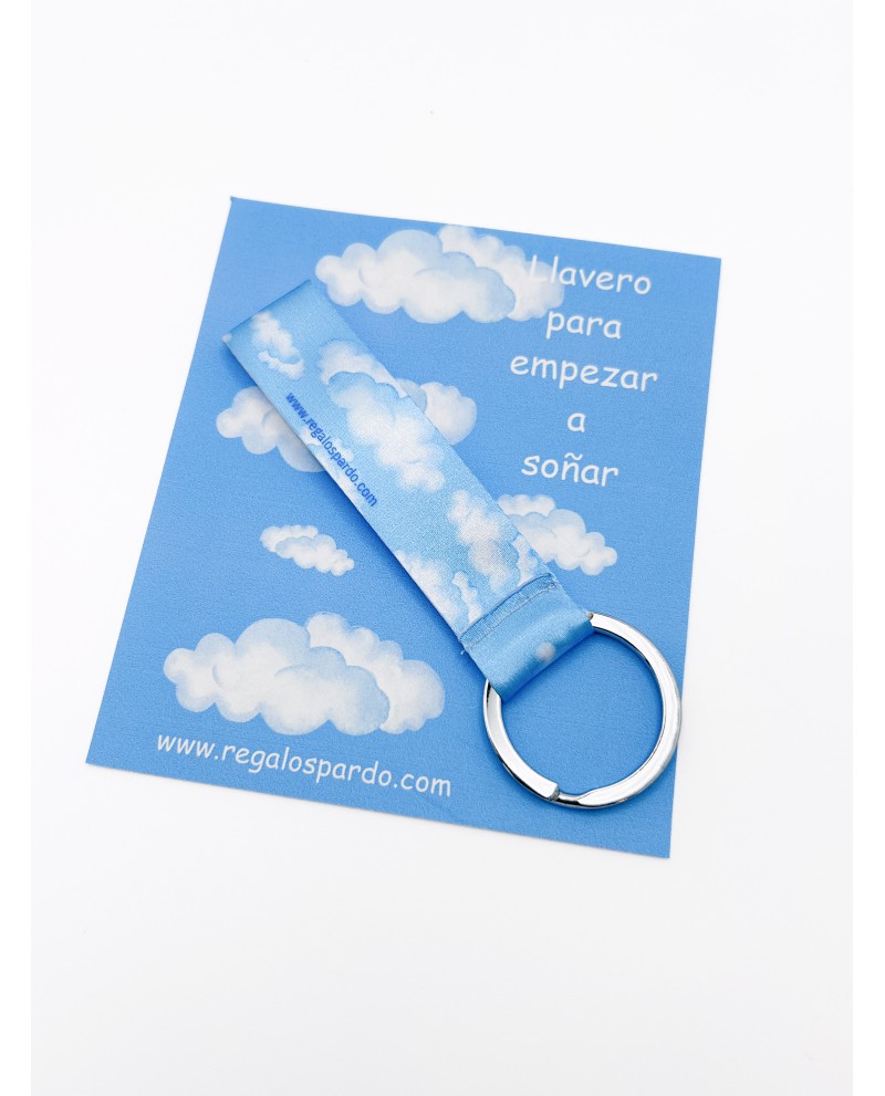 Este llavero de tela en tonos azules con estampado de nubes transmite un mensaje lleno de ilusión: “Sueña a lo grande”.