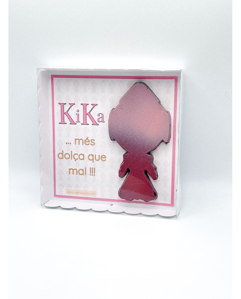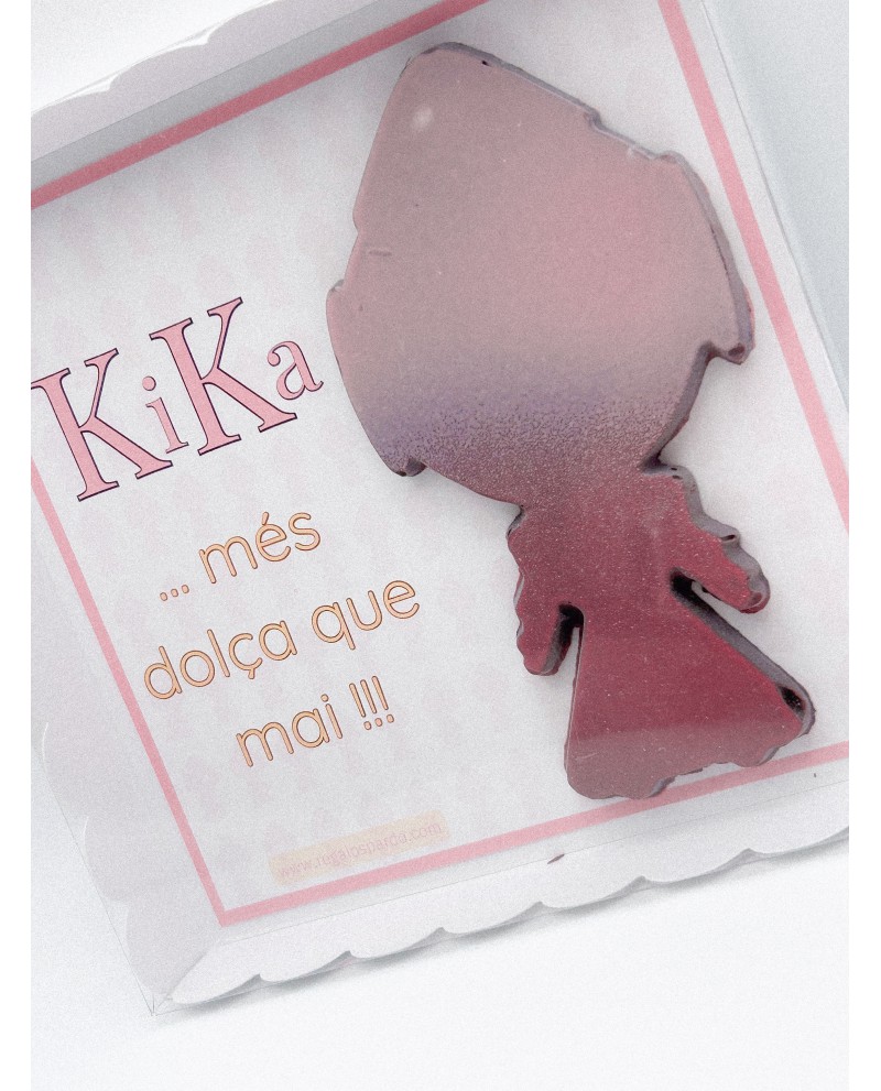 Sorprende con esta deliciosa tableta de chocolate con forma de Kika, la fallerita más entrañable. Una creación exclusiva de Regalos Pardo que une tradición y dulzura en un detalle único.