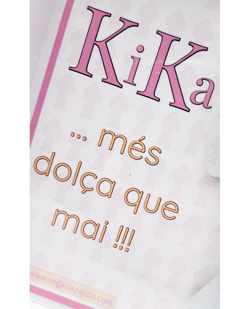 Cada tableta está elaborada con exquisito chocolate puro y presentada en una cajita personalizada con el mensaje “Kika, més dolça que mai”. Perfecta para regalar en Fallas, como detalle especial en comisiones, para representantes o simplemente para endulzar cualquier momento.