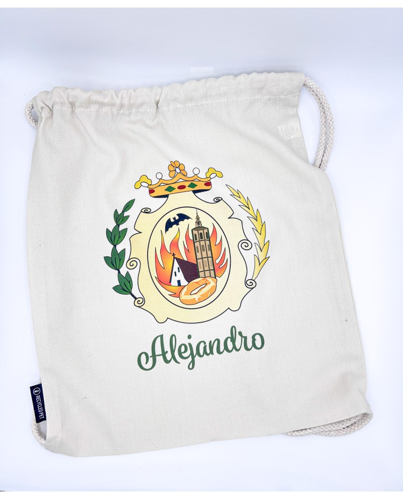 Saco mochila fallera personalizable con el motivo a elegir, escudo de falla, boceto de falla, etc..., ideal como regalo de una comisión.