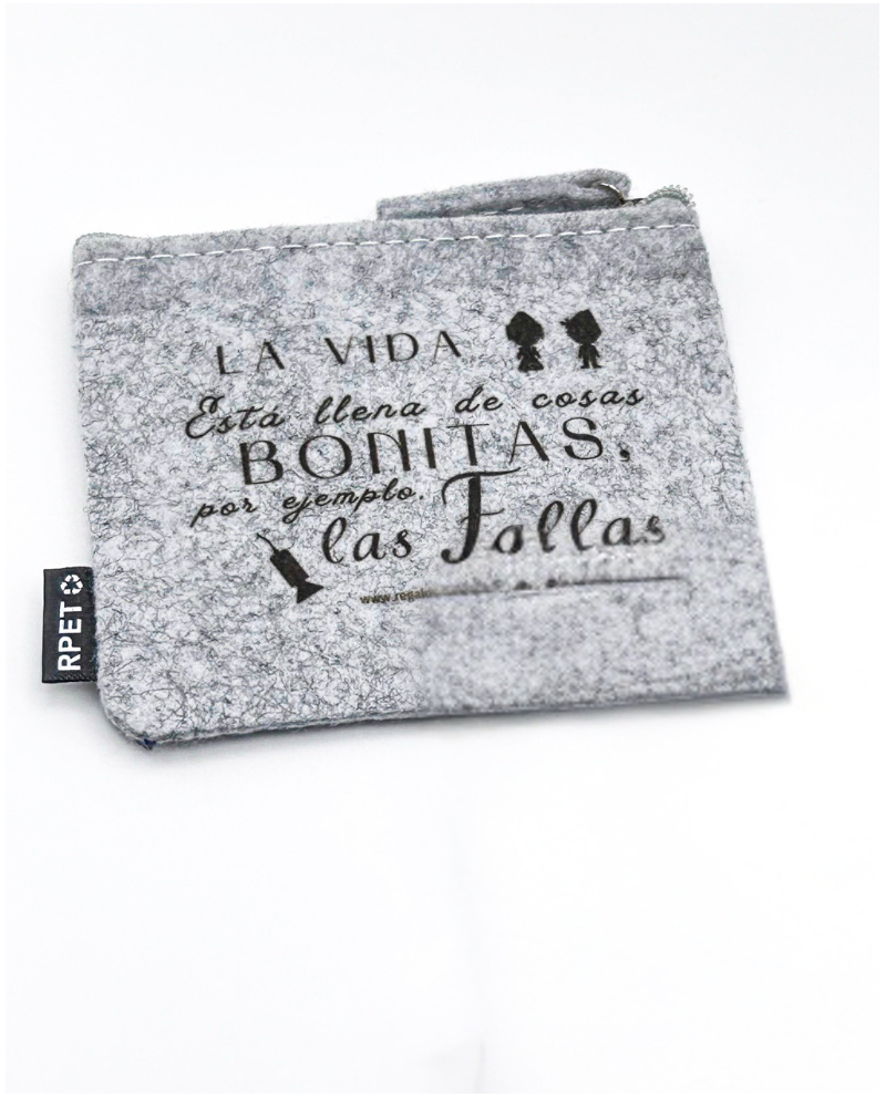 Monedero de fieltro gris con frase fallera. Ideal como detalle para comisiones y cargos falleros. Ligero, práctico y con cierre de cremallera.